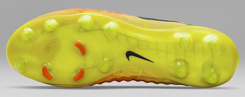 「マジスタ」を履くプレイヤーにとって、足を回転させる動きは重要なため、母指球の周囲にV字のスタッドを配置。これはNikeスポーツ研究所(NSRL)のFEAデータに基づいたもので、さらに加速のため半円柱系のスタッドが足の外側と内側に、かかとの安定感向上とスピードを止めるためのスタッドもそれぞれデータに基づいて配置されている。