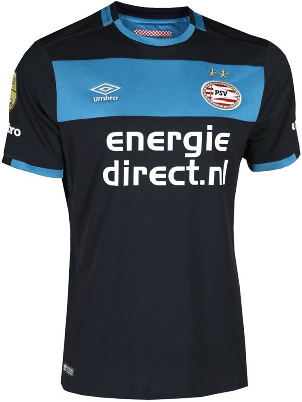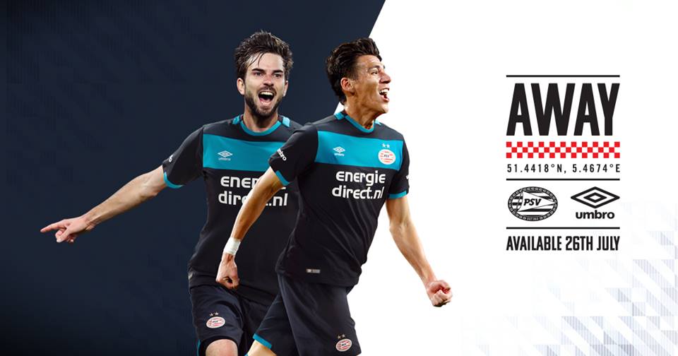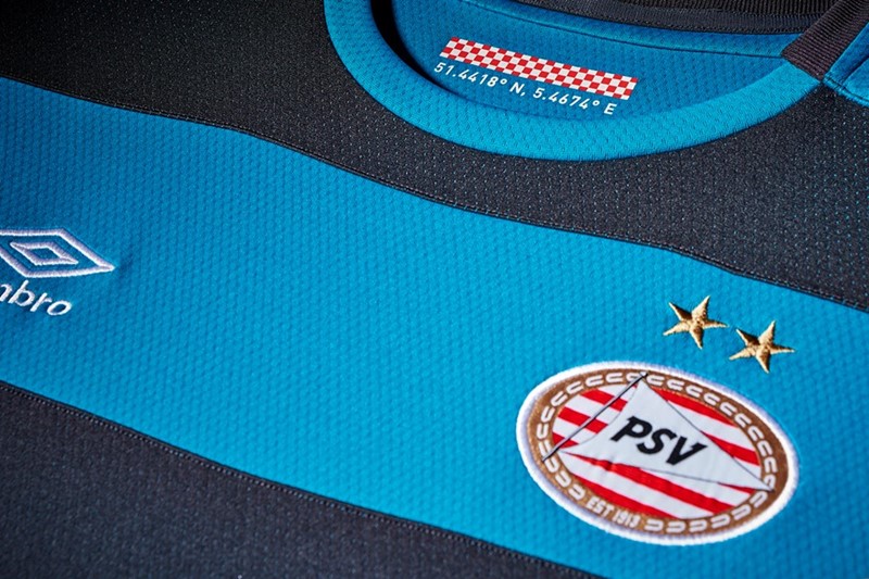 タグ部分に入れられた「51.4418°N, 5.4674°E」はホームのフィリップス・スタディオンの所在地。ユニフォームにもよく使われているチェック柄はアイントホーフェンの街がある北ブラバント州の州旗に由来している。