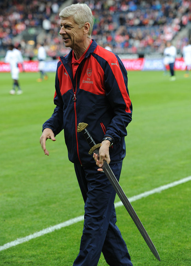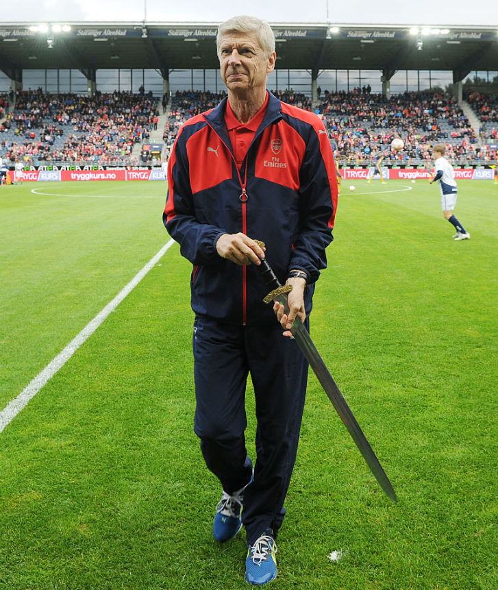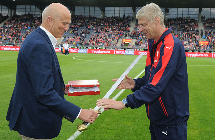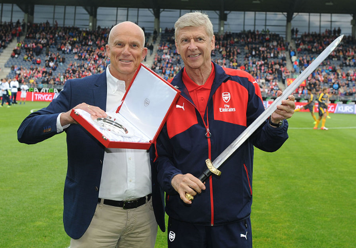 ヴィーキングのオレ・ルグラン会長とアーセン・ヴェンゲル監督が贈呈品を交換。ヴェンゲルがゲットしたのは、剣!