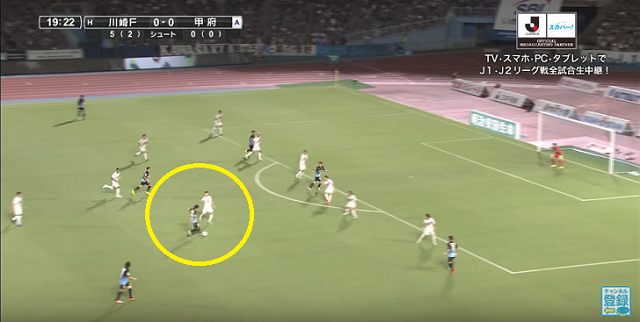0-0で迎えた20分、大久保嘉人からアタッキングサードでパスを受け取った中村はルックアップすると、大塚翔平へ向け浮いたスルーパス!