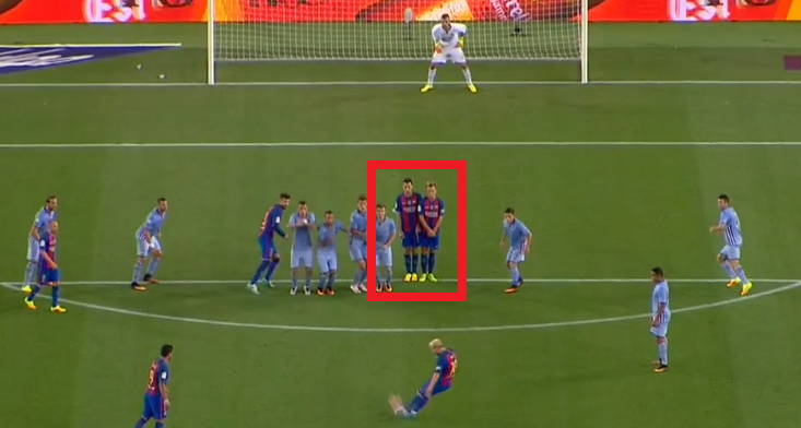 鋭いカーブを描きゴールを貫いたメッシのシュートだが、キックの瞬間が見えないようにバルサの選手がGKの前に立っている。