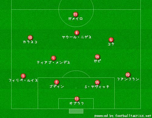 新加入FWガメイロの下に3人を置く様な形。前線にはグリーズマンやトーレス、アンヘル・コレアがいるほか実力者ガイタンも加わったため、バリエーションは増えそう。