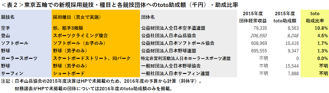 さて、2020年の東京五輪ではリオでの全競技に加え、5つの競技が追加実施される事になりました。もちろん、これらの新競技団体にもtoto助成があり、しっかりと使われているだろうと思っていた時期が、<表2>を作るまではありました(苦笑)。