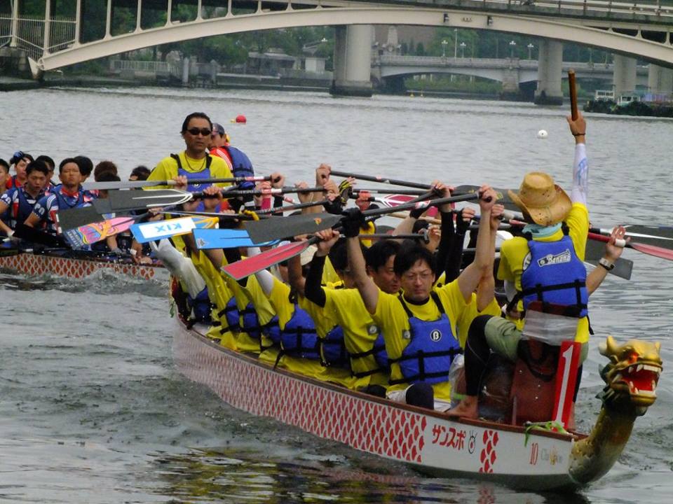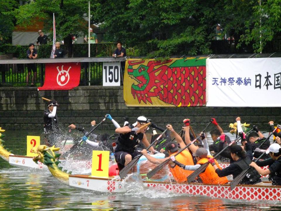 2016年7月17日開催の日本選手権より。「天神祭奉納」として行われ(上)、ボートには「サンスポ」のロゴ入り(下)。出典:日本ドラゴンボート協会Facebookページ(こちら)