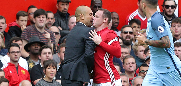 スローインのボールを巡って、ウェイン・ルーニーとジョゼップ・グアルディオラ監督が一瞬ファイト!
