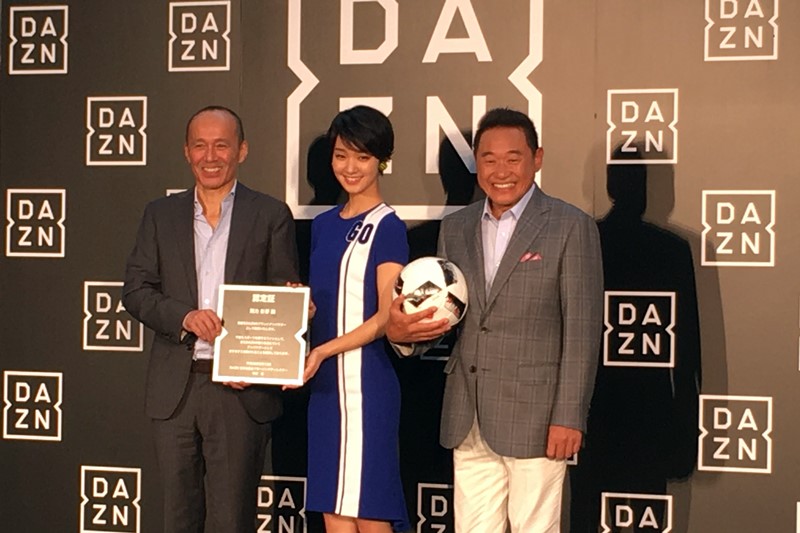 この日のバス始動イベントでは、『DAZN』のブランドアンバサダーに就任した女優の剛力彩芽さん、さらにサッカー解説の松木安太郎さんが登場(左はDAZN日本の中村俊社長)。