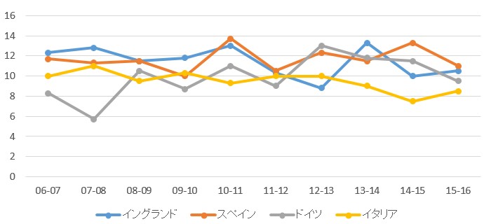 この比較から見えてくることは、前半5年間(2006-07から2010-11まで)は平均12-13ポイントとほぼ並んでいた6チームに、現在はイングランドとそれ以外で大きな差が生まれているということだ。そこには、プレミアリーグからリーガの2強へ旅立ったスアレス、ベイル、モドリッチのようにタレントの流出といった側面もあるだろう。