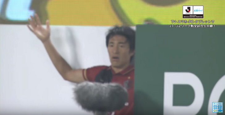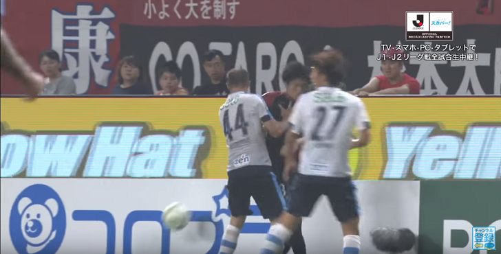 3-0とリードして迎えた86分、タッチラインの外で磐田DFアヴラーム・パパドプロスが突き飛ばし、金崎は広告板に激突してしまったのだ。