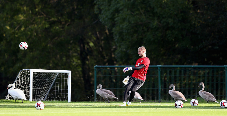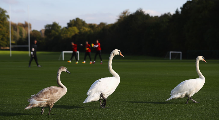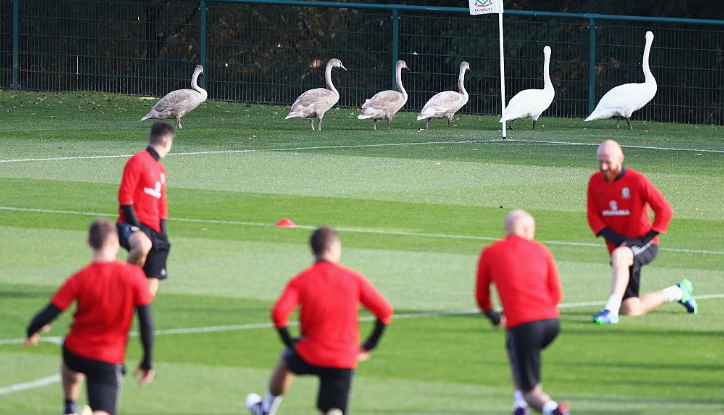 ウェールズで白鳥といえばスワンズの愛称を持つスウォンジーというクラブもあるが、その姿に見入っている選手も…。