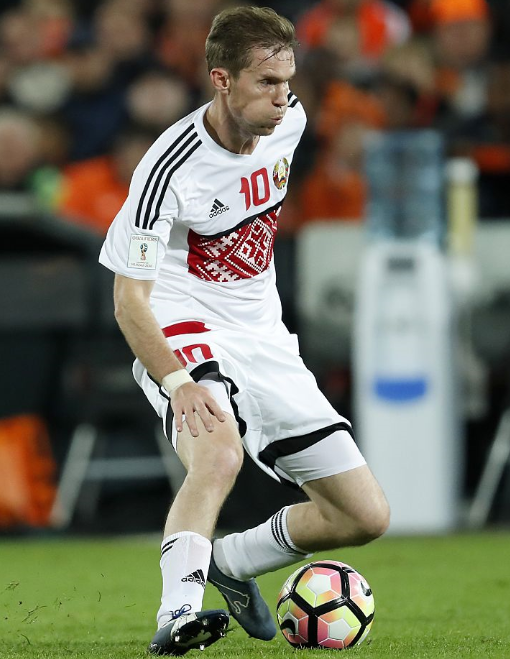 かつてアーセナルやバルセロナにも所属していたMFアリャクサンダル・フレブ。35歳になった彼は今もベラルーシ代表としてプレーしている。