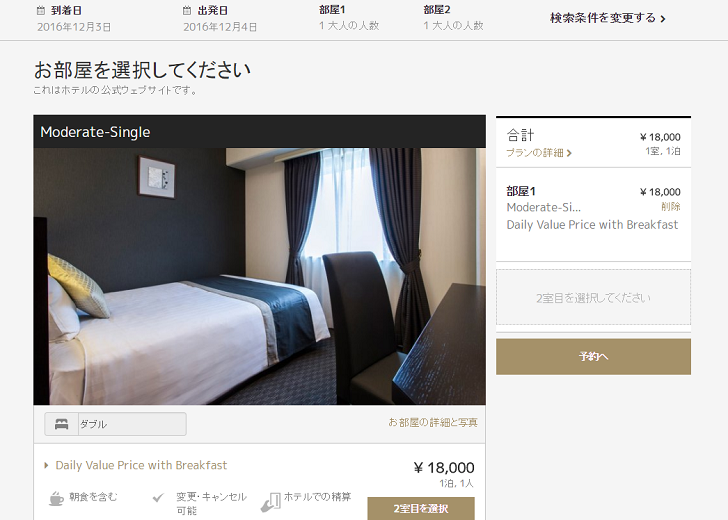 大阪の一等地、梅田駅の目の前にある「新阪急ホテルアネックス」でダブルベッドの部屋が1万8000円で予約できることが判明した。