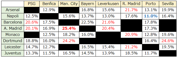 他にもドルトムント対アトレティコ・マドリーが24.2%、ドルトムント対セビージャが24.6%となかなか高い確率になっている。