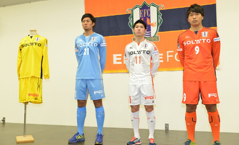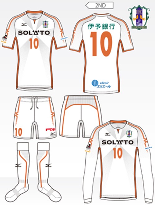 全身オレンジの愛媛はかなり新鮮。10年目を迎えたサプライヤーのMizunoとともにJ1昇格を狙う。