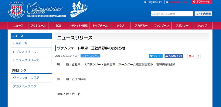 2017シーズンに向け、ヴァンフォーレ甲府が正社員を募集している。