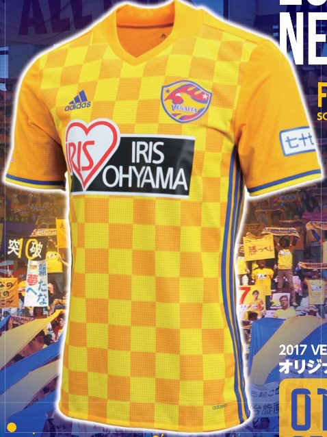 ホーム(1st)はベガルタゴールドを基調に、クラブ史上初のチェック柄を採用。スリーストライプスはadidasの最新モデルらしく脇の配置だ。