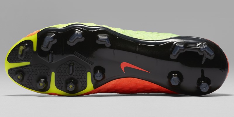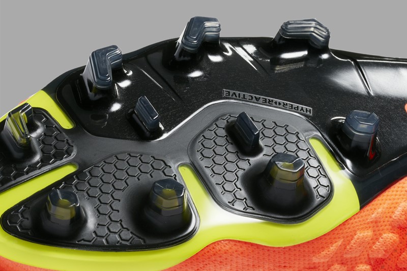 「プレーヤーが自信を持ってカットをできるように、回転と踏み出しを効果的に促す六角形のスタッドを使用しています。両側にはトラクションを高めるために、V字型の突起をつけています」というヴァン・アッタ氏の言葉通り、特に鋭い角度での横方向のカットの動きを高めるため工夫が凝らされている。その分、グリップ性の高いインソールを採用し、スパイクの中で足が動きにくくした。
