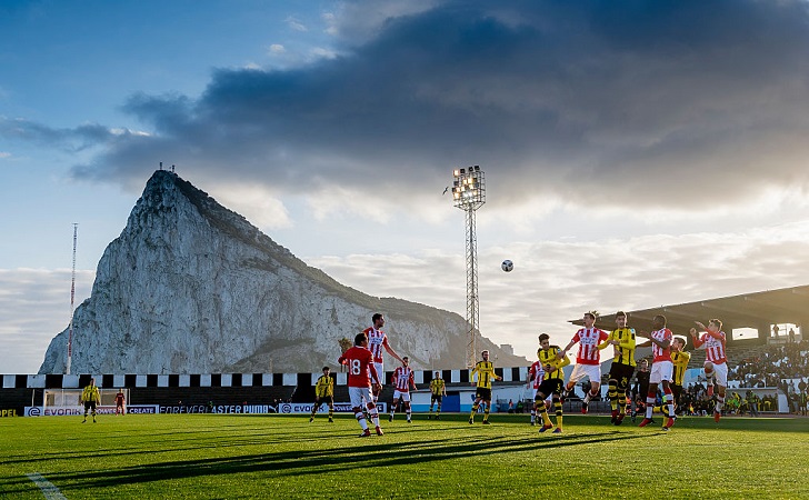 ジブラルタルはイベリア半島の南東部に位置しており、スペインと陸続きでありながらイギリスの海外県であるという特殊な事情を持つ。ジブラルタルの山はこのスタジアムの目と鼻の先にあり、ピッチから見るとこのようにそびえ立って見えるのだ。