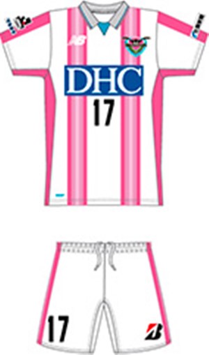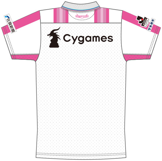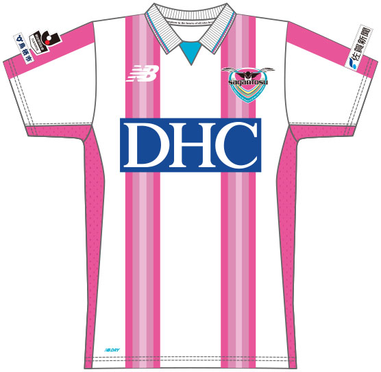 アウェイは白を基調に、サガンピンクのストライプをグラデーションでさわやかさをもたらすように配置。襟部分には差し色のサガンブルーのストライプをシンプルに配色している。
