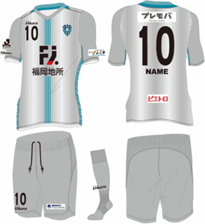 アウェイ(2nd)は近年定着しているシルバー。差し色に使用しているブルーベールダンスは、ネイビーブルー、シルバーと同様に福岡のクラブカラーだ。