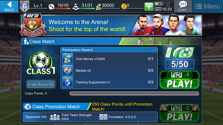 アリーナは、同じ「クラス」のライバルチームと試合するモード。試合を行うだけで参加賞がもらえるので、気軽に参加することができる。