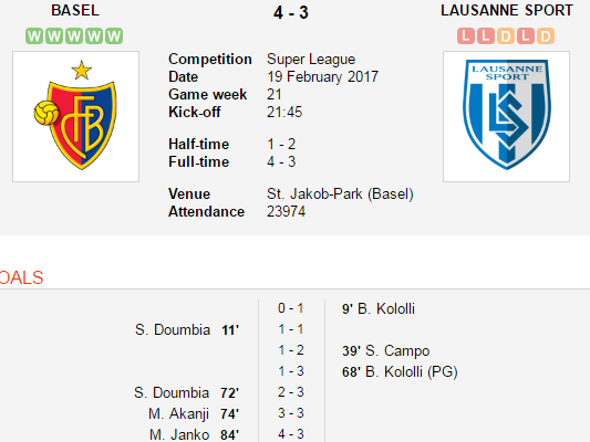 だが、バーゼルは元Jリーガーでもあるセイドゥ・ドゥンビアらのゴールで3点を奪取!なんと大逆転で勝利してしまったのだ。『Soccerway』で得点経過を見るとこんな感じ。