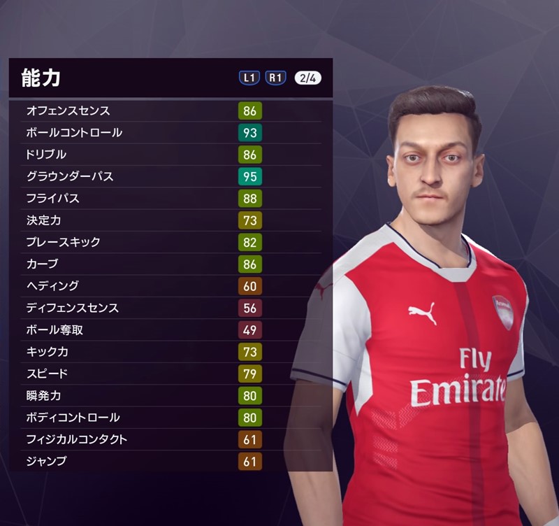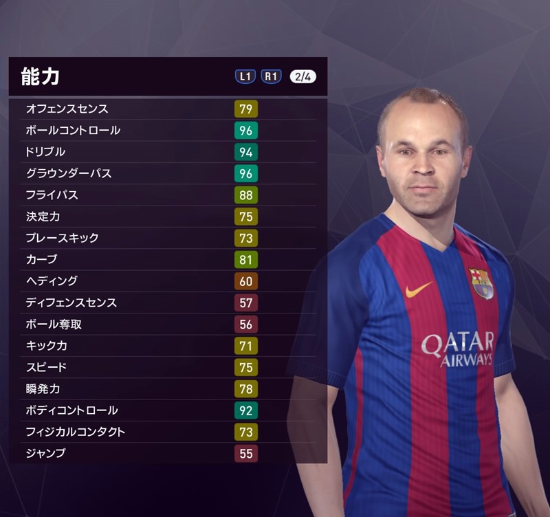 1位は、やっぱりイニエスタ!ボールコントロール96が頭一つ抜けた数値である上、ドリブル94、グラウンダーパス96、さらにボディコントロールも92と、チャンスメイカーとして突出したレベルだ。