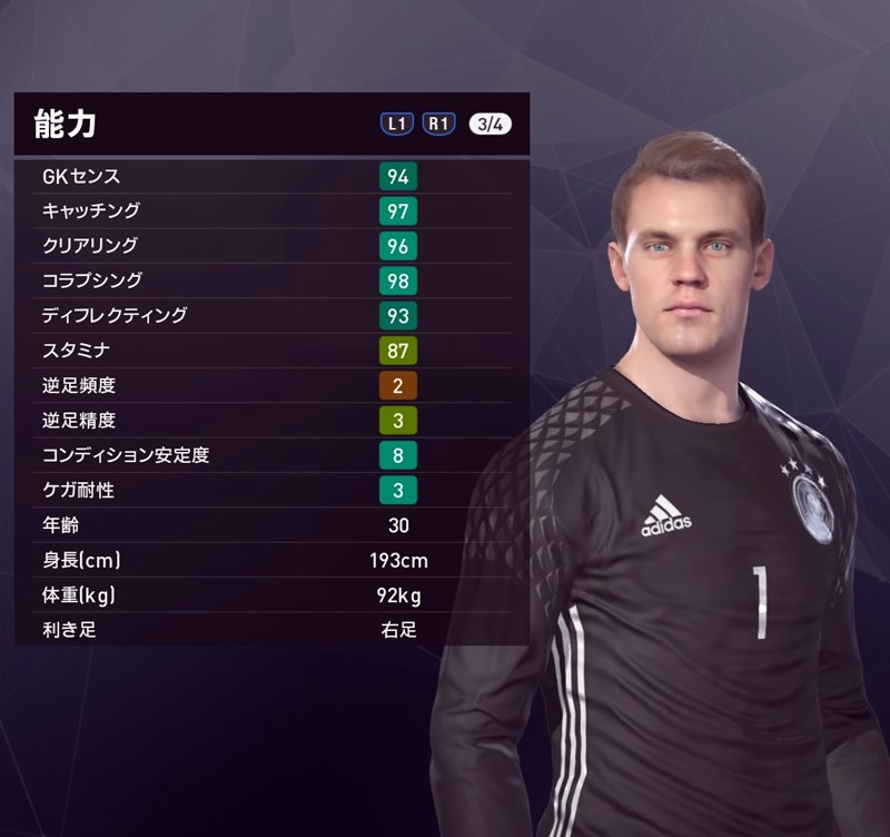 言わずと知れたドイツ代表の怪物GK、ノイアー。スケールの大きさは過去の名手たちと比較してもある意味破格であり、新時代の守護神像を築き上げた。スタミナ87は彼ならではだろう。