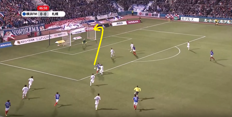 0-0で迎えた47分、横浜FMは左サイドから齋藤学が中へとパスを送る。