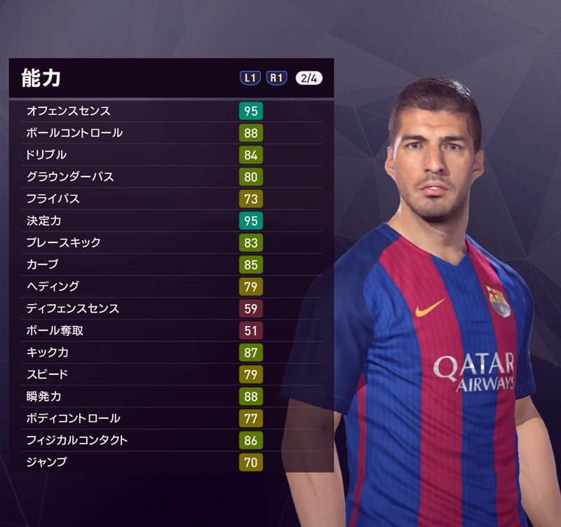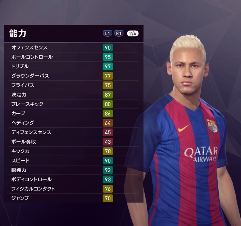 今回はネイマールの能力をピックアップすると、ボールコントロール95、ドリブル97と圧巻のテクニック!スピードやボディコントロール、さらに決定力も非常に高い。