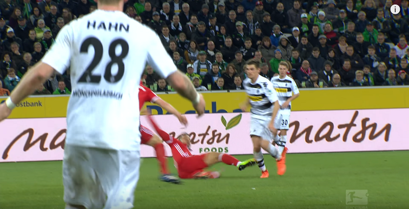 主審のトビアス・シュティーラーはプレーを止め、バイエルンのファウルという判定を下す。ボルシアMGとしては、得点のチャンスだった。
