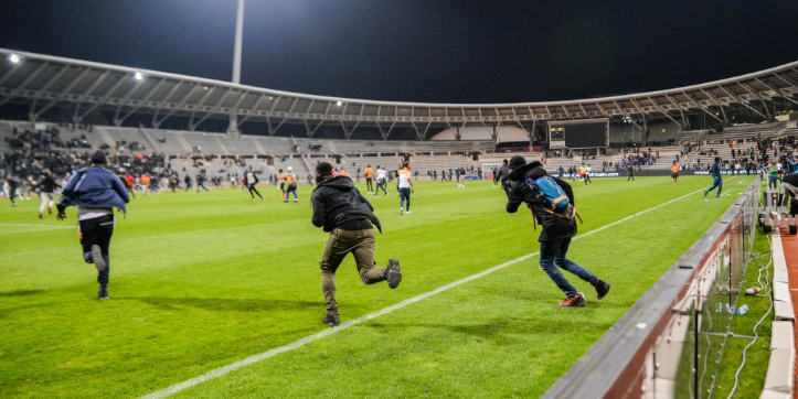1-1で迎えた試合終了間際に、スタジアムのフェンスを乗り越えて観客たちがピッチに乱入。その前からスタンドではトラブルになっていたという。
