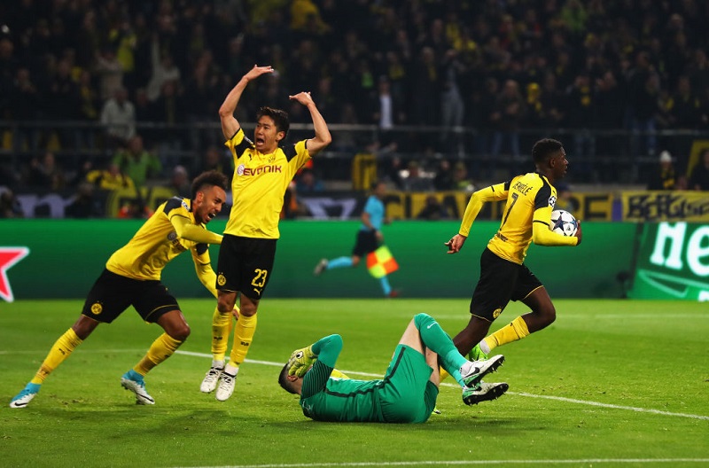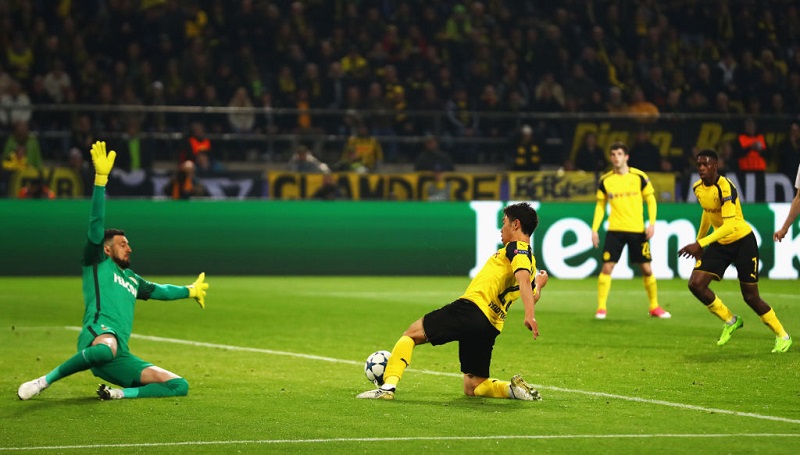 ラファエル・ゲレイロのクロスをピエール・エメリク・オーバメヤングがアクロバティックな形で落とし、ボールは香川真司のもとへ。相手GKと一対一になった香川であったが、これを冷静になかへと折り返し、ここにウスマヌ・デンベレが詰めてゴール!