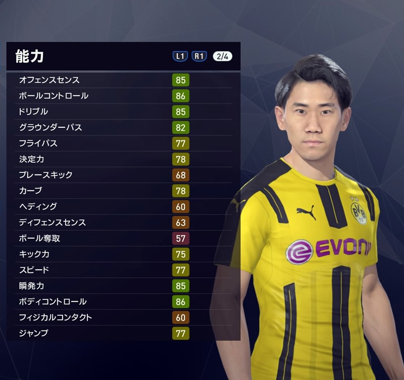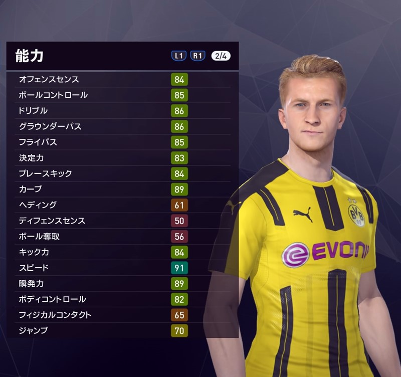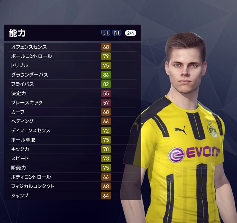 今季リーグ戦ではオーバメヤングに次ぐ出場時間を誇っており、21歳にしてまさに中心選手の一人。武器はパスでの展開力で、グラウンダーパスはさすがの86だ。