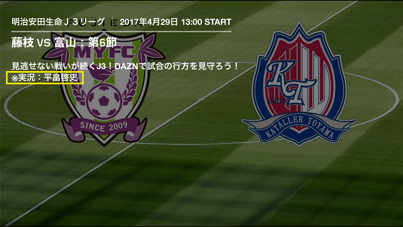 こちらは、今月29日(土)に行われるJ3第6節藤枝MYFC対カターレ富山戦の待機画面。なんと、実況者の欄に平畠氏の名前があるではないか!