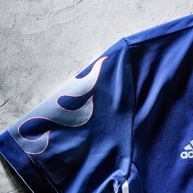 adidasのロゴが入った青いシャツ。その袖に、これは…炎…!?