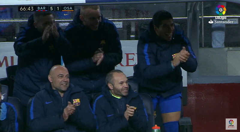 ホームゲーム、4点差でのリード、さらには試合終盤という条件が重なったから可能となった今回の“サプライズ”。この時、バルサ選手たちがベンチで見せたリアクションがおもしろかった(「YouTubeで見る」からご覧ください)。