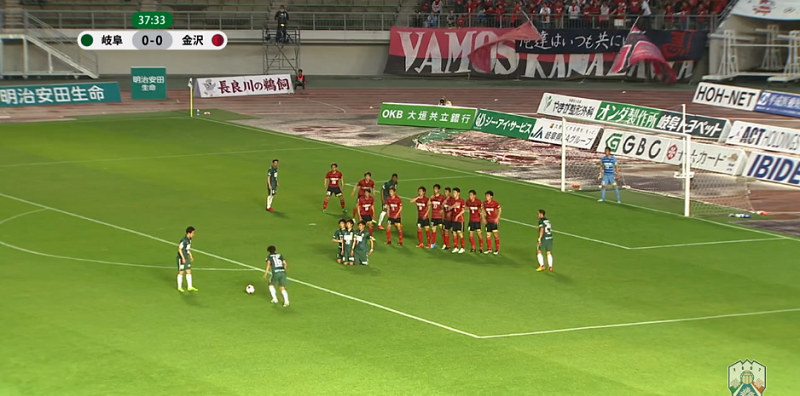 これに対して金沢は6人から7人が壁に入ったのだが、なんとその手前に岐阜の選手がさらに壁を作っていた!