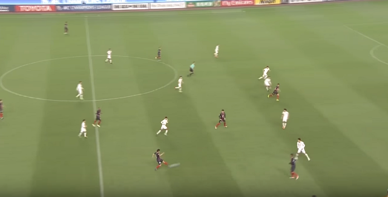 鈴木のポジションを考えると、この場面では右足でインスイングのパスを送るのがセオリーだろう。