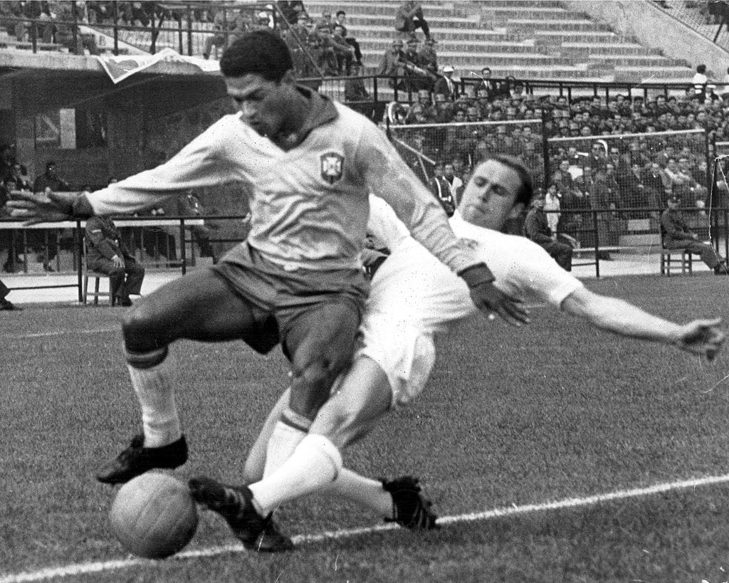 ブラジル代表の伝説的ドリブラー、ガリンシャ。病気によって両足の長さが違うというハンディを抱えていたが、それをむしろ長所にしたかのようなトリッキーな動きで、何度も世界を魅了した。