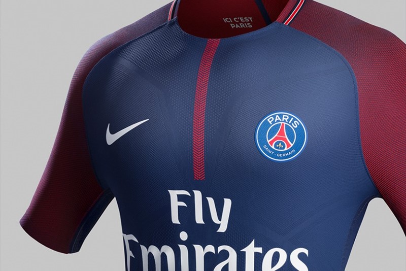PSGの2017-18ホームユニフォームは青を基調に、肩から袖にかけての切り替えしが特徴的なデザイン。