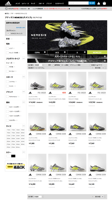 こちらはadidasの公式オンラインショップに掲載されている「ネメシス」のラインナップ。