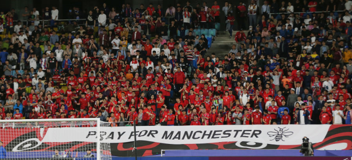 マンチェスターで起きたこと(テロ事件)についてのビッグフラッグには、『マンチェスターのために祈ろう』と書いてあった。