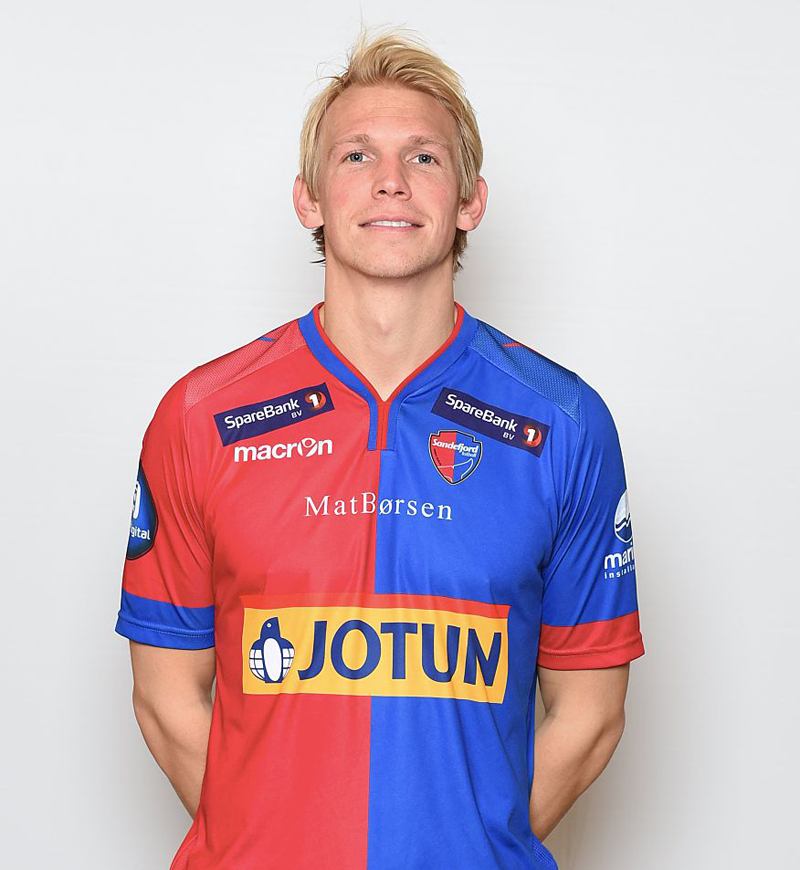 ノルウェーのクラブ、サンネフヨルのユニフォームで2014、2015シーズンモデルのホームキット。このシーズンからMacronのキットを使用している。写真はアレキサンダー・ガブリエルセン。