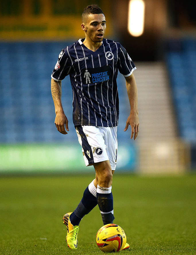 熱狂的(というか熱すぎる)サポーターが有名なミルウォールのユニフォームは、2013-14シーズンモデルのホームキット。濃紺に白のピンストライプがなかなかオシャレだ。写真はライアン・フレデリックス。