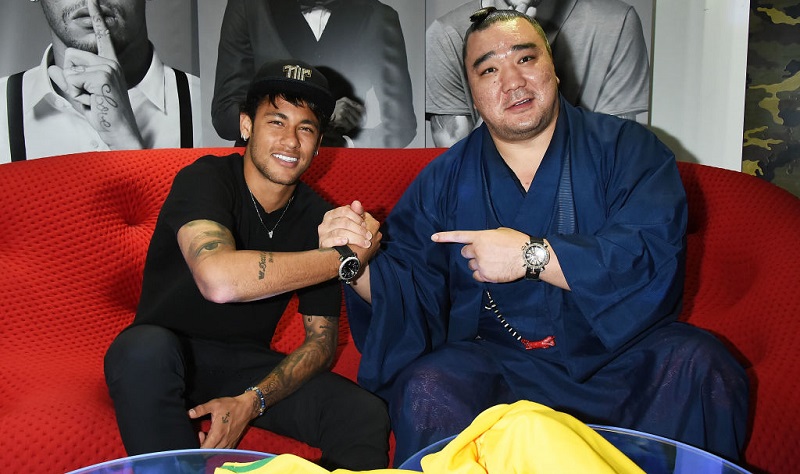 GaGa MILANOの原宿店でネイマールが対面したのは、第70代横綱の日馬富士!ネイマールは同社ともスポンサー契約を結んでいる。