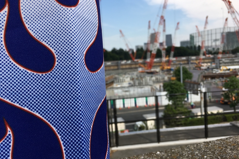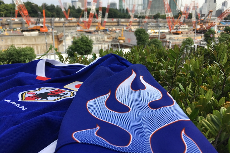 本当であれば工事現場の様子をお届けしたいところだが、直で撮るのはどこからか怒られてしまいそう…。よって、東京体育館の方へ登り、持参した「炎ユニフォーム」の背景としてさりげなく収めてみた。