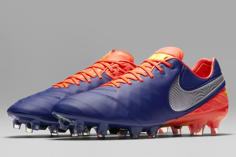 カンガルーレザー採用のフィット系モデル『ティエンポ レジェンド VI』は、クロームカラーのスウッシュに独特の模様が描かれている。