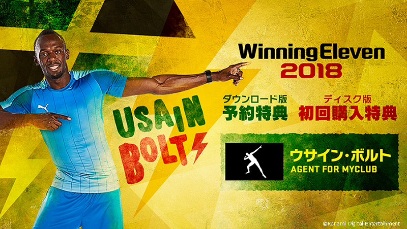 「ウイイレ」シリーズのファンでもあることから今回、『ウイニングイレブン2018』のアンバサダーに就任。ダウンロード版の予約特典やディスク版の初回購入特典として用意される「サッカー選手ウサイン・ボルト」がトレイラーでひと足早くお披露目されている。