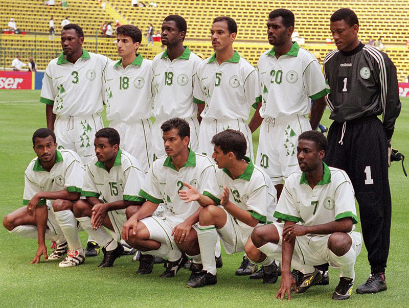 サウジアラビア王室がデザインを手掛たという独自ブランド、Shamel製のホームキット。白をベースに緑が美しいユニフォームだった。ただゴールキーパーユニフォームのみadidas製。GKはワールドカップ予選やアジアカップなどで幾度となく日本代表の前に立ちはだかった“アジアの黒蜘蛛”、モハメド・アル=デアイエだ。