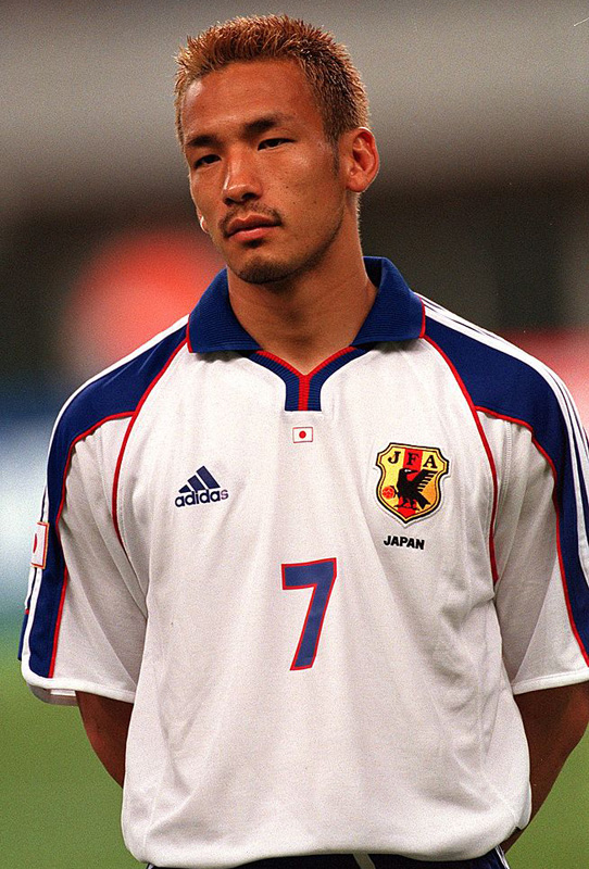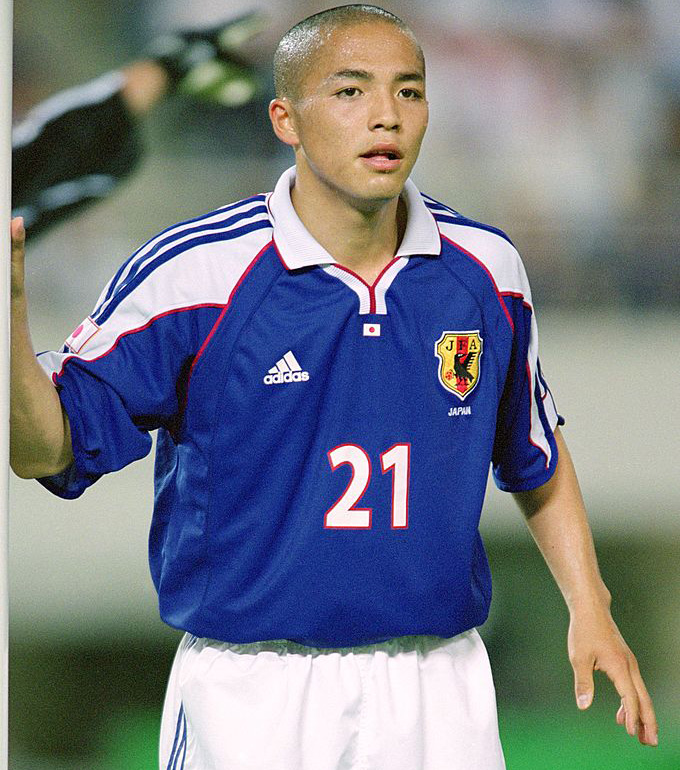 胸元の日の丸が特徴的なadidas製2001年モデルのホームキット。2000年アジアカップや1999年ワールドユースなどで着用した1999-2001モデルと、2002ワールドカップで着用した2002-03モデルの間に挟まれ、短期間の使用に終わったユニフォームだった。小野伸二は全試合に先発で出場した。